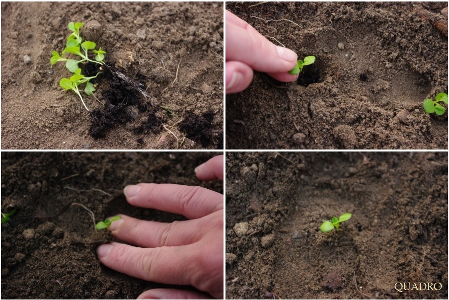 To co można było wysiać wysiane, co można było wysadzić – wysadzone. Pikowanie czy też flancowanie to jak się okazuje nie taka prosta sprawa jakby mogło się wydawać:) Kto wychował się w ogrodzie, będzie wiedział wszystko z autopsji bądź od Babci, Dziadka czy Rodziców. Kto nie miał tyle szczęścia, a uczy się w tym kierunku, może spodziewać się całego wykładu na temat wysadzania, pikowania, flancowanie itp. Dowie się też, że rośliny oddychają korzeniami (sprawdzone doświadczalnie!), pobierają nimi wodę i składniki pokarmowe (również sprawdzone:)), a woda pomaga roślinie zachować tzw. turgor, czyli prawidłowe nawodnienie, czy też raczej mówiąc wprost – trzyma ją w pionie, a liście w poziomie:) Kto zapomniał kiedyś podlać kwiatka widział jak ten oklapł, a jak w końcu go podlał (ale nie zasuszył go wcześniej), to mógł obserwować, jak ten się podnosi. Żeby roślina mogła wykonać te wszystkie skomplikowane czynności:) musi być dobrze posadzona w ziemi tak, aby ta dokładnie przylegała do korzeni; młode roślinki więc delikatnie wyciągamy z donicy lub rozsadnika, rozdzielamy. Pikulcem lub palcem (szybciej, jeśli gleba nie jest mocno ubita) robimy dziurkę i ostrożnie wkładamy korzonki do dziurki. Nie zawijamy ich – jak są za długie – ucinamy. Roślinkę trzymamy za liścienie. Drugą ręką zasypujemy dołek i dociskamy mocno glebę wokół korzeni. Sadzimy równo z gruntem lub w niewielkim dołku. Nieco głębiej możemy posadzić pomidory i ogórki – te u nasady łodyżki mają niewielkie wypustki (dodatkowe korzenie) – te dodatkowo wesprą roślinę kiedy ta podrośnie i wspomogą w pobieraniu składników pokarmowych. Roślinkę podlewamy delikatnie, najlepiej z małej konewki (przynajmniej na początku). Musimy tak ją posadzić, żeby mocno trzymała się w glebie, aby nie wypłukał jej silny deszcz (anomalie pogodowe odkładamy na bok). W wielkim skrócie wygląda to tak: