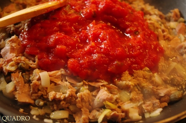 Makaron z tuńczykiem i kaparami w sosie pomidorowym