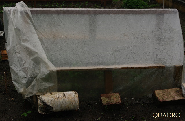 2. Jeśli sadzonki mamy już na zagonie i jest ich więcej, można „pożyczyć” od Męża trochę materiałów i na szybko skonstruować szklarnię prowizoryczną. Potrzebne będą witki wierzbowe, albo deski, łaty, bądź gięte pręty metalowe (jak w tunelu) – wszelkie resztki jakie znajdziecie w warsztacie. Starczy to połączyć śrubami (wkrętarka niezawodna), wbić (wkopać) w ziemię i na takim szkielecie rozłożyć przezroczysta folię. Typowa do szklarni jest dość droga i sporych rozmiarów (w LM najmniejsza szerokość to 6 m), ale wystarczy taka budowlana (pożyczyłam:)), albo nawet grubsza malarska. Folię rozkładamy, boki zasypujemy ziemią i dociskamy cegłami, drewnianymi klockami (pożyczyłam:)) Od frontu i od tyłu zostawiamy miejsca „na zakładkę”, aby szklarnię/tunel móc otwierać (mocne słowo:)) i wietrzyć w cieplejsze dni. Za klamkę u mnie robią…cegły. Pożyczone:) Konstrukcja przetrwała dwie ulewy i burzę, więc chyba jest ok:)